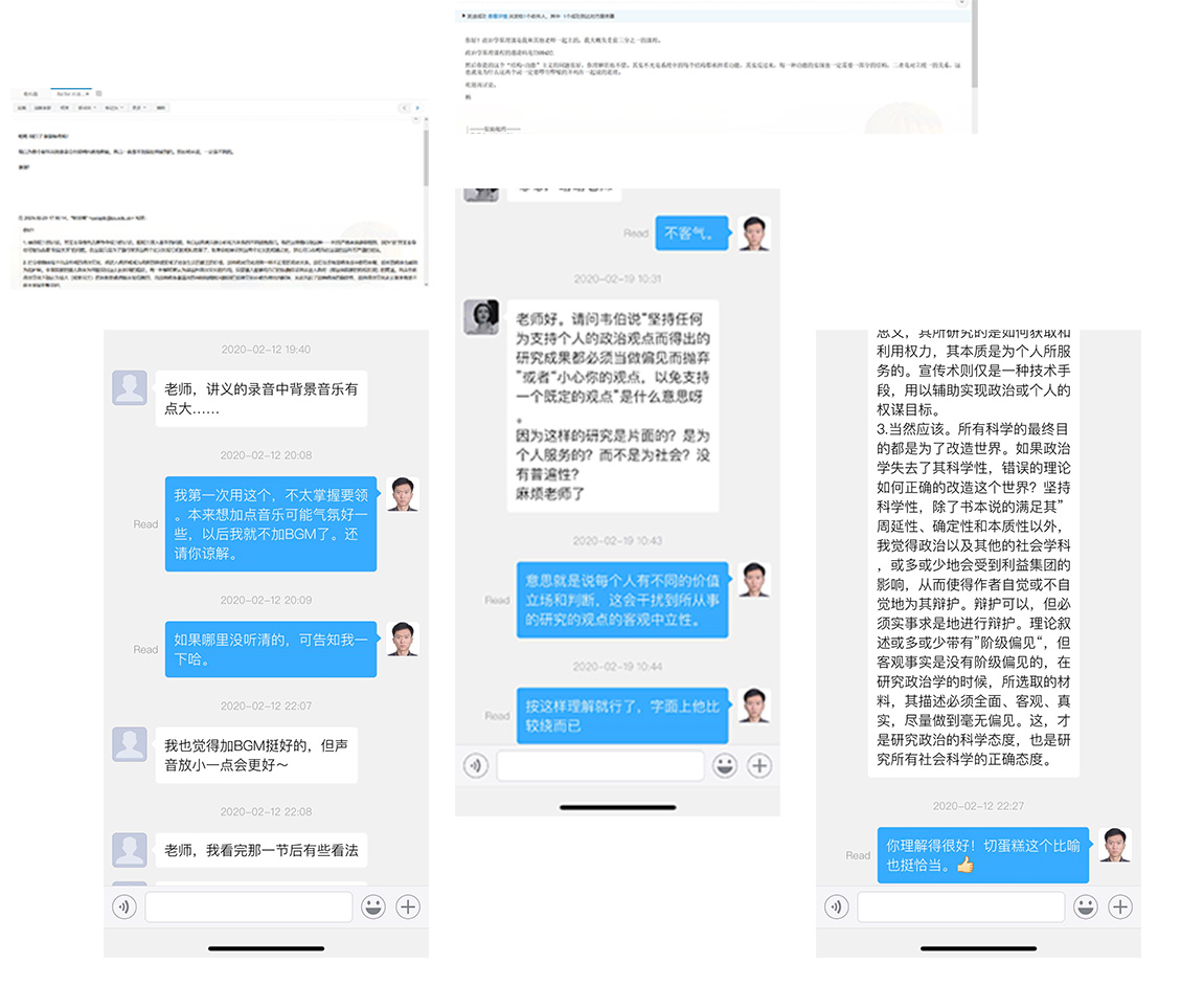 在目前的网络教学中,我比较注意课程讨论的个体性。由于课程内容的特性,学生需要在阅读过程中独立思考比较复杂的政治学基本问题,思考的过程意义远大于结果。也正是深知学生的思考在课程的前期一定是不成熟的(学生们也自知这一点),我在学习反馈模块的设定中没有选择讨论板这类公共性的应用,而是鼓励学生给教师个人发学习通消息或电子邮件来阐述自己的观点或提出自己的疑惑。其中我认为较为普遍的问题,会反馈在下一次课的录音和教学设计中。这种更“私密”的交流方式,一方面照顾到学生在这个年龄阶段普遍存在的心理特征和状态,另一方面也让师生之间的交流变得更加“平等”,教师不是高高在上的问题解决者,而是一个为学生阅读政治学文献服务的帮手和顾问。