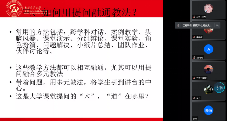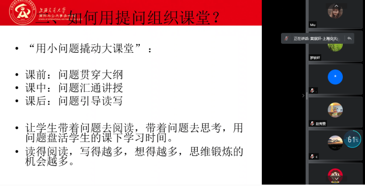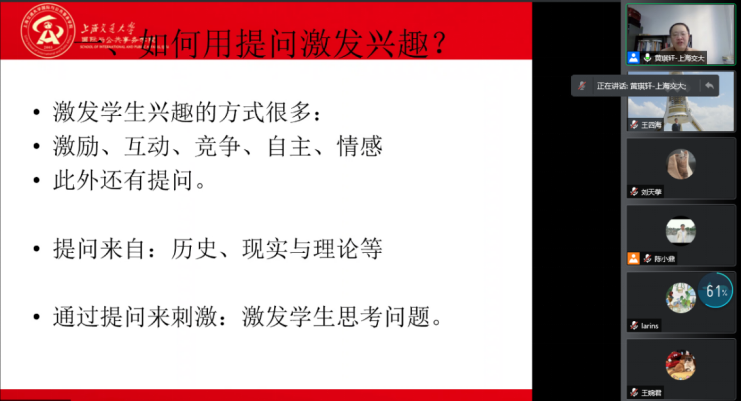 教师做了题为“以问题贯穿课堂:用提问激发兴趣”的线上讲座,副院长陈小鼎教授主持。