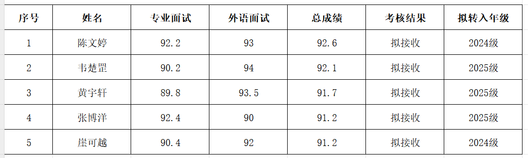 根据《h漫 2025年接收转专业学生方案》的工作要求,经学生本人申请、资格审查、面试考核,现将h漫 2025年转专业拟接收名单公示如下: