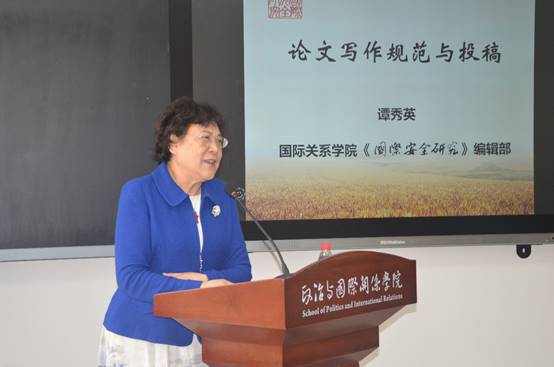 讲座伊始,汪金国教授对二位老师的到来表示了热烈欢迎。然后,谭秀英老师首先做了题为《论文写作规范与投稿》的精彩讲座。谭秀英老师于1980年入职中国社会科学院世界经济与政治研究所担任编审(三级研究员),曾任世界经济杂志社副社长、《世界经济与政治》编辑部副主任、主任、常务副主编。2013年起任国际关系学院《国际安全研究》期刊主编,2015年起任国际关系学院英文刊International Security Studies执行主编,兼任中国国际关系学会中国国际关系期刊研究会会长、中国社会科学院评价研究院期刊评价专家委员会国际政治学科主任委员。谭秀英老师长期从事国际关系学杂志的编辑工作,拥有坚实的学术功底和丰富的审稿经验。在此次讲座中,她结合自身的体会,从“写好论文、遵守规范、投对期刊”三个方面详实地介绍了在学术论文写作与投稿过程中需要注意的问题。