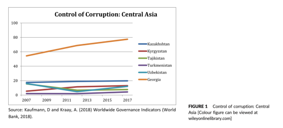 地方性腐败是中亚国家(哈萨克斯坦、吉尔吉斯斯坦、塔吉克斯坦、土库曼斯坦和乌兹别克斯坦)的顽疾,也是原苏联时期的遗留问题。自1991年脱离苏联独立以来,它们曾多次试图解决此问题,措施涉及遵守、预防和控制环节:更严格的反腐败法、起诉知名罪犯、实行政务公开与问责、通过教育和培训提高认识、公众监督政府预算等。然而调查结果并不乐观,根据“自由之家”的报告(2019年),其对“政府运作”的评分为1-12分,其中12分是政府运作最高得分。评分依据源于三个方面:民选政府首脑和国家立法代表是否决定政府政策;政府是否普遍存在的腐败现象;政府是否对选民负责并以公开和透明的方式运作。中亚国家表现不佳:哈萨克斯坦(1/12)、吉尔吉斯斯坦得分(4/12)、塔吉克斯坦(1/12)、土库曼斯坦(0/12)和乌兹别克斯坦(1/12)。