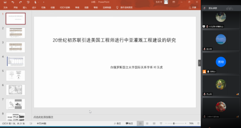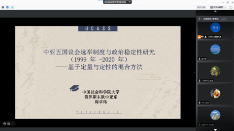 开幕式后,论坛分为“中亚问题研究”、“俄罗斯东欧问题研究”、“上合组织与地区问题”三个分论坛同步进行。在“中亚问题研究”分论坛中,李芳玲、石越洋、韩彦雄、张彤彤、陶安杰、连丹丹、叶玉虎、尉锦波、刘奇、周卓玮等同学以“美国国际开发署对中亚五国援助实践分析——动机、过程及其影响”、“中国与乌兹别克斯坦非传统安全合作的驱动因素”、“命运共同体视阈下中吉抗疫合作分析”“中国对中亚国家援助动机与效果分析——基于点-轴理论的视角”、“扎帕洛夫时期吉尔吉斯斯坦政治转型分析”、“吉尔吉斯斯坦反对派”“20世纪初苏联引进美国工程师进行中亚灌溉工程建设的研究”、“吉尔吉斯斯坦为何反复爆发‘革命’?——基于与乌兹别克斯坦的比较”、“哈萨克斯坦人道主义救援行动‘茹桑’:成效与困境”、“中亚五国议会选举制度与政治稳定性研究(1999-2020年)——基于定量与定性的混合方法”为题宣读了论文。h漫