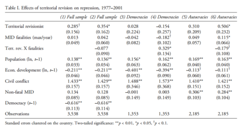 表一说明了不同变量在领土冲突中是如何影响国内压制的。作者使用了6个不同的数学模型,将数据代入进行计算,得出各变量与压制之间的关系。其中,最为重要的是领土修正和领土修正中最大死亡人数和压制的关系。根据数据显示,总体上领土修正和压制成正相关,但在“民主国家”并不如在“威权国家”那样明显。而压制在领土冲突中总体上与最大死亡人数成负相关,但在民主与威权国家之间有所不同,在前者有所增加,而在后者有所减少。