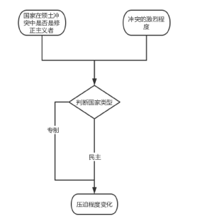 作者根据已有研究,赞同前人国内压制程度与领土冲突存在关联,且不同类型的国家在压制上有所区别的观点。作者将国家在领土冲突中是否是修正主义者、冲突的激烈程度设为自变量,其中国家类型为控制变量,将国内压制程度设定为因变量。其关系如下图可见: