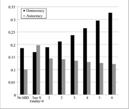 论证:相比于“民主国家”,“威权国家”更关注领土的资源财富等现实利益。在这种情况下,国内压制是一种常常被用来保护精英阶层不受外界影响的工具。但有限的军事资源使得他们在国内压制、国外冲突中难以两全。国际冲突对资源的限制给威权国家带来了类似经济制裁的外生性困境,极大地影响了国内的政治权衡。所以,如果一场领土冲突足够严峻,即将资源投入到这场冲突中足够有利,“威权国家”即使以维持国内压制为代价也会选择投入。反之,非致命的冲突时期,当需要消耗的军事资源很少时,国内压制可能会增加。总之,当冲突时期变得更加致命时,“威权国家”实际上可能不得不减少国内压制,以充分追求海外胜利。