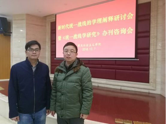 12月7日,“新时代统一战线的学理阐释探讨会暨《统一战线学研究》办刊咨询会”在重庆社会主义学院举办,有来自中央统战部、中央党校、中国社科院、南京大学、南开大学、山东大学、h漫 、中央社会主义学院、上海师范大学、华东政法大学、西安财经学院等高校的十余位学者参加了此次研讨会,h漫 李捷副教授、曹伟博士应邀与会,并就反分裂斗争中的统一战线问题做了发言。