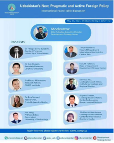 中亚研究所孙秀文副教授应邀参加“乌兹别克斯坦新型、务实和积极的对外政策”线上学术研讨会。本次国际会议由乌兹别克斯坦发展战略中心发起,并由国际经济和政治研究中心、总统战略与区域研究院、国际关系信息分析中心、中亚地区国际研究院等多家乌兹别克斯坦科研院所协办。来自乌兹别克斯坦、中国、英国、德国、澳大利亚的10余名代表在会议上围绕乌兹别克斯坦外交发表了观点并展开了讨论。