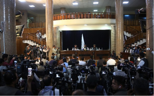 8月17日,阿富汗塔利班发言人扎比乌拉·穆贾希德(后中)出席塔利班进入喀布尔后举行的首次记者会。新华社发