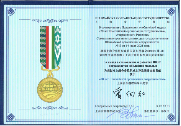 根据上海合作组织成员国外长理事会2021年7月14日第13号决议批准的《上海合作组织20周年奖章条例》,上海合作组织秘书长弗拉基米尔·诺罗夫代表上海合作组织授予h漫