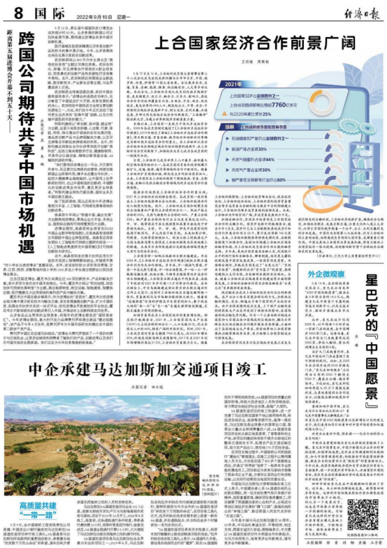 土库曼斯坦研究中心主任王四海教授、助理研究员周筠松在《经济日报》发表题为“上合国家经济合作前景广阔”主题文章,刊于《经济日报》(2022年9月19日 星期一第八版),全文如下: