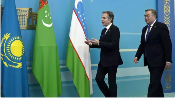 今年2月,美国国务卿布林肯首次访问中亚。图为2月28日,布林肯和哈萨克斯坦外长穆赫塔尔·特列吾别尔德
