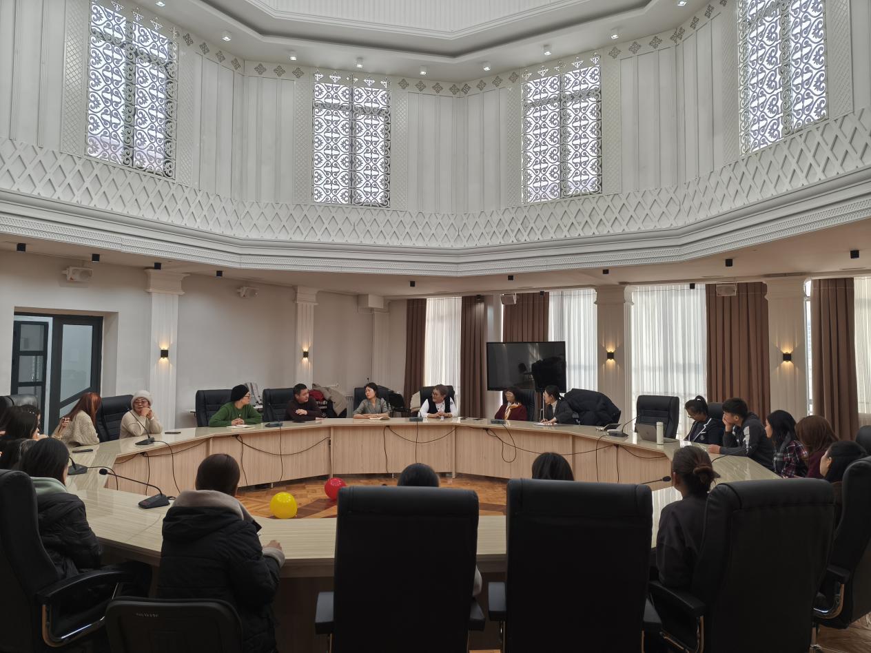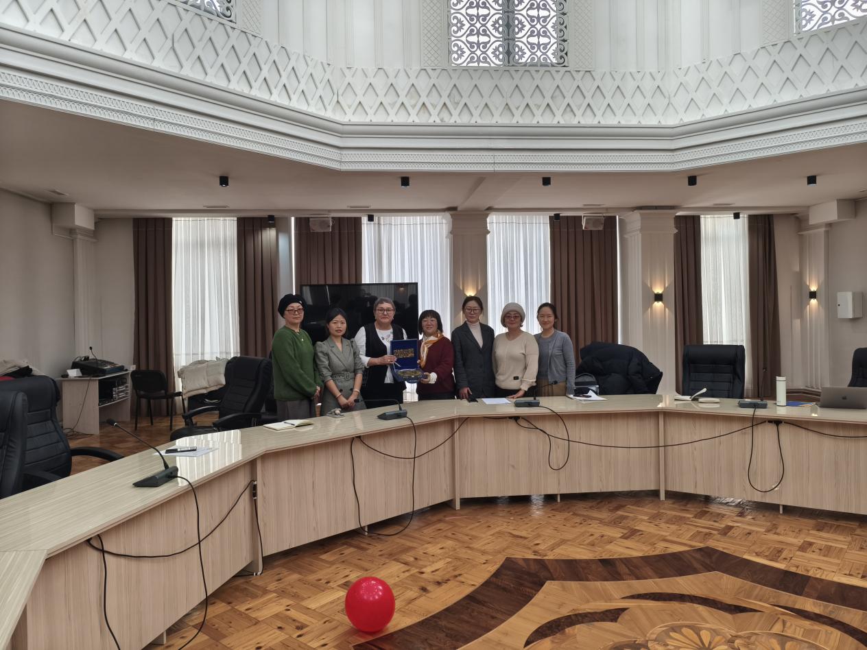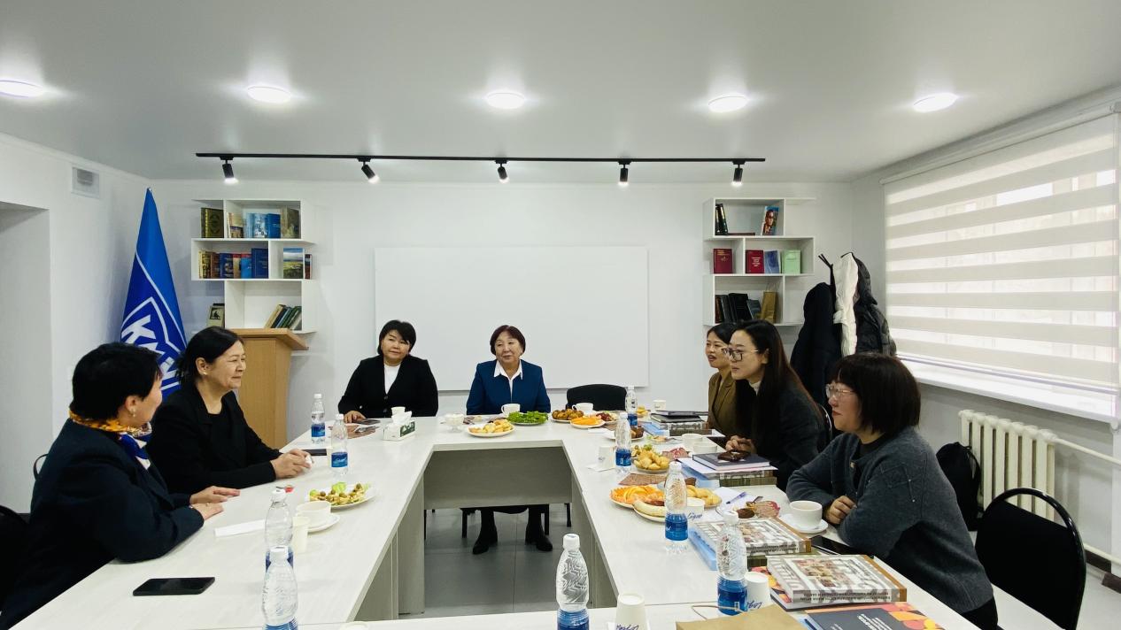 在吉尔吉斯斯坦国立阿拉巴耶夫大学历史与社会法律教育系,代表团与系主任乔尔蓬·阔依楚曼诺娃、各教研室负责人及近三十名学生举行座谈。双方介绍了各自研究特色和人才培养理念,并就未来的合作方向和具体操作等达成共识。