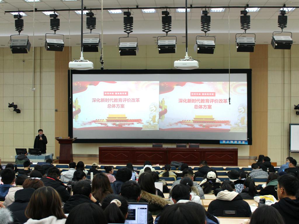 本次大会分为三个部分展开。第一部分由雷老师详细讲解中共中央国务院印发的《深化新时代教育评价改革总体方案》这一新中国第一个关于教育评价系统改革的文件。他分别从指导思想、主要原则、改革方向等方面一一为同学们介绍学习,并重点强调党委政府评价、教师评价、学校评价、学生评价、用人单位评价五个方面的改革。在第二部分,雷老师通过对《h漫
