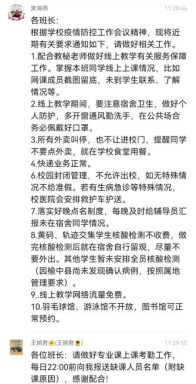 除了上课过程中老师与同学们的互相配合,课后督导也保障着线上教学工作的顺利进行。为保证及时了解未到学生情况以及同学们的线上学习情况,学院要求各班班委对参加网课的学生签到情况进行截图留底。课后,任课教师们及时在学习通等网络教学平台上传教学课件、电子教材、课程音视频、参考资料等学习资料,便于同学们在课后进行查漏补缺以及更深入的学习研究,为同学们的学习成效提供有力保障。在课余生活中,各班班主任和学委也积极联系同学,了解大家的学习情况和生理心理状态。学院党委副书记贾海燕老师、2021级2班班主任米鹏举老师还在网课期间到学生宿舍了解同学们线上学习的情况。贾海燕老师总结道:“我们要响应学校线上教学的要求,提高线上教学质量,克服教学困难,提高学习效率。同时同学们也要注意身体健康,积极配合防疫工作。”