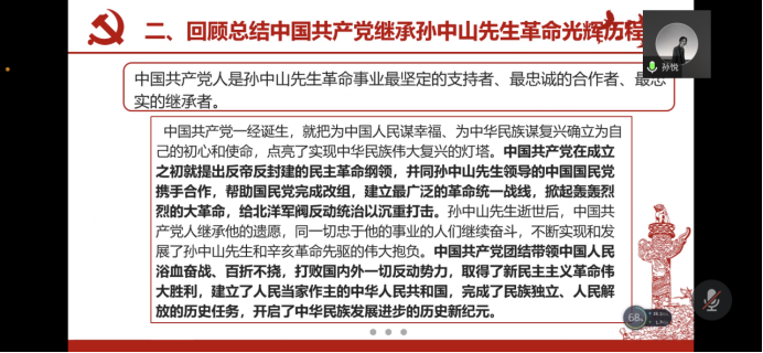 活动伊始,班委们首先对前来参会的同学进行签到点名,并详细讲述本次活动的主题内容和学习意义。随后,学习活动正式开始。从“辛亥革命的具体历程和历史意义”、“中国共产党人是孙中山先生革命事业最坚定的支持者、最忠诚的合作者、最忠实的继承者”、“辛亥革命对于民族复兴、祖国统一的意义”、“习总书记在辛亥革命110周年纪念大会上的金句”几个方面带领同学们回顾辛亥革命的革命历程和历史意义,深入学习总书记在大会上的讲话精神。在这一过程中,他们还为同学们播放纪念辛亥革命110周年的宣传视频,用生动形象的方式增强辛亥革命精神对于青年人的感召力,彰显新时代下青年人所应具备的责任和担当。同时,在深入学习习总书记在纪念辛亥革命110周年大会上的讲话后,同学们对于实现当今两岸的和平统一与中华民族伟大复兴的民族伟业产生了更深刻的认识和理解。最后,同学们各自在本次主题团日活动中的学习心得进行发言交流,“以史为鉴,开创未来”“脚踏实地,久久为功”成为同学们的普遍共识。