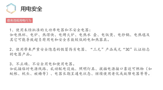 在日常生活中,宿舍既是我们生活、学习、休息的地方,又是同学们交流思想、培养综合素质的重要活动场所,宿舍安全就显得尤为重要。其中最大的安全隐患就是用电安全。李伟向大家列举了一些常见的宿舍违规用电行为,希望同学们可以规避此类事件发生,以免给人身安全造成威胁和带来财产损失。