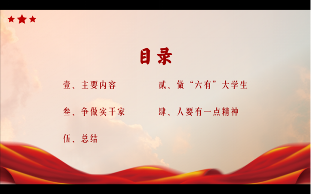 粱宵华:习近平总书记曾经在纪念五四运动100周年大会上说过:“一代人有一代人的长征,一代人有一代人的担当。”那么作为新时代的青年大学生,我们的长征,我们的担当就是实现中华民族的伟大复兴的中国梦。作为大学生的我们,是未来社会的栋梁,因而大学生在这个成长成才的阶段,因该埋头苦干,大量的积累理论知识,这样才能够在实践中用理论去指导实践,在实践中检验理论知识;但是大学也并不是一个象牙塔,大学生必须要把所学的知识运用到实践当中去,结合到社会当中去,才能获得真知灼见。