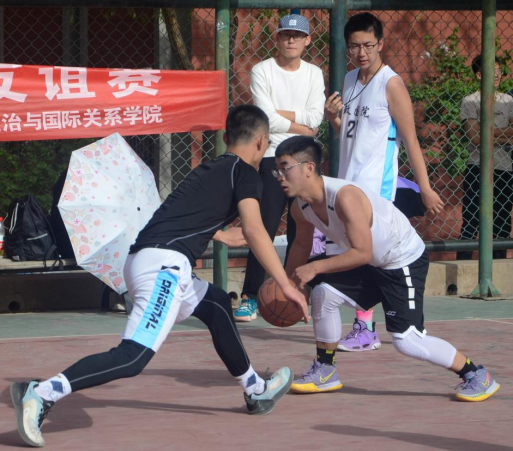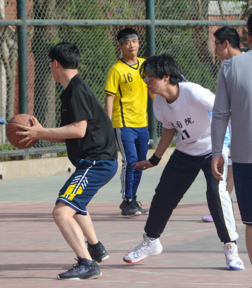 在短暂热身过后,双方队员各自就位。伴随着一声哨声,球被抛向空中,学生队刘一博与米老师同时高高跃起争夺球权,只见刘一博手一拨,学生队率先拿到球权发起进攻。上半场时间内,学生队受到老师们的压制,得分暂时落后于老师队伍,但他们并没有因此气馁,在中场休息时及时调整战术。下半场开始,学生队伍的快速反攻,高密度防守让得分差距慢慢缩小,老师队伍得分不再那么轻松,双方打得有来有回,比赛呈胶着状态,战况激烈。比赛进行到最后一分钟,比赛双方仍然积极防守和进攻。最终,学生队伍惜败老师队伍。赛后,老师们为学生队传授自己多年的篮球经验,同学们积极吸取经验,相信在老师们的经验分享与日常刻苦的训练后,h漫