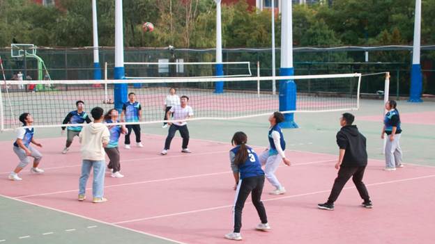 比赛开始前,各个球员积极热身,摩拳擦掌,彼此加油打气,雄赳赳气昂昂,向着赛场进发。随着一声哨响,小小的排球被高高拍起,比赛一触即发。在这秋高气爽的季节,在这人声喧嚣的球场,一声声的加油呐喊似乎快要穿透耳膜,而赛况也随着愈发大声的呼喊声愈发激烈,双方你来我往,紧咬比分,球员们拼尽全力誓要赢得比赛。