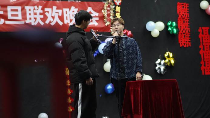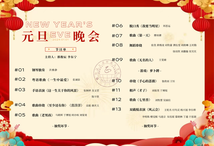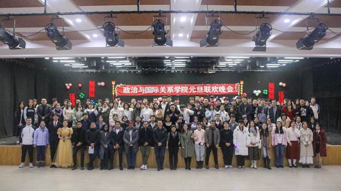 元旦晚会于2024年1月1日晚19:00在芝兰苑三楼学生活动中心顺利举行。本次活动由学院2023级政治学类二班郭俊辰同学、2023级研究生李东宁同学主持,学院党委书记常虹老师、党委副书记贾海燕老师、2023级政治学类一班班主任李亮老师、2022级政治学与行政学班班主任梁朕朋老师、研究生辅导员雷怀瑞老师、本科生辅导员田歌老师出席,学院数百名学生到场观看。