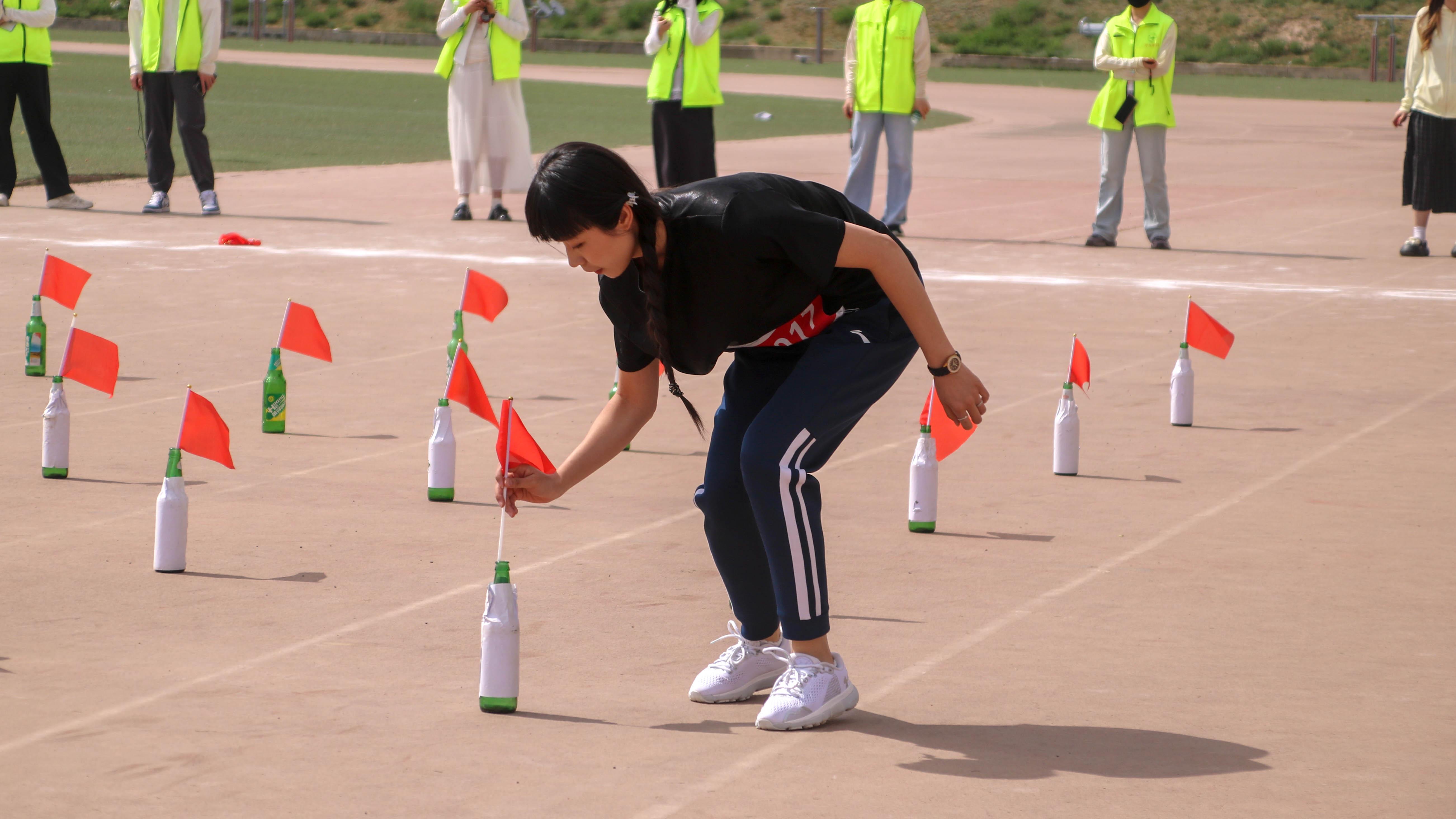 哨声吹响,选手们如离弦之箭冲向插旗点,迅速拔旗折返。脚步在跑道上快速交替,手中旗帜翻飞,赛场边加油声此起彼伏,短短25米,尽显敏捷与果敢。