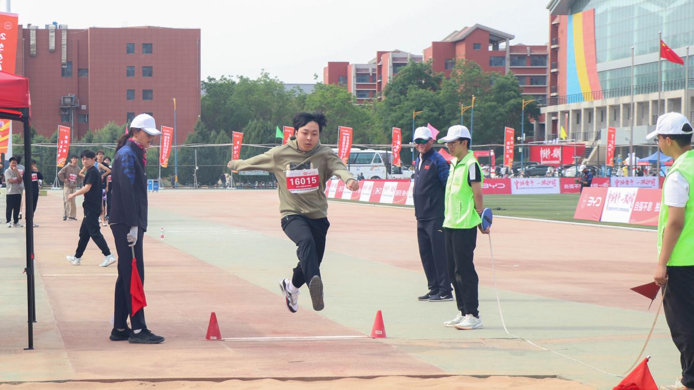 选手双脚用力蹬地,双臂向前挥摆,整个身体腾空而起,而后在空中舒展。落地时,膝盖微曲缓冲,沙地上顿时陷出两个清晰的脚印,飞扬的沙粒缓缓落下,记录速度与力量交织的荣耀时刻。