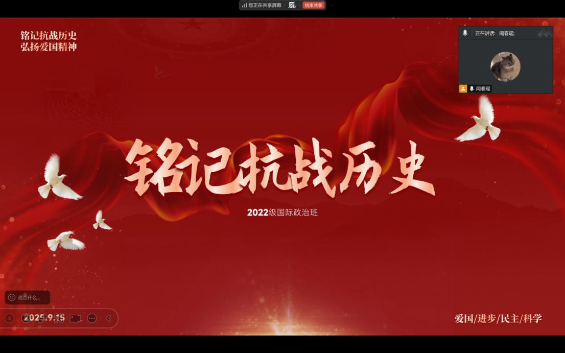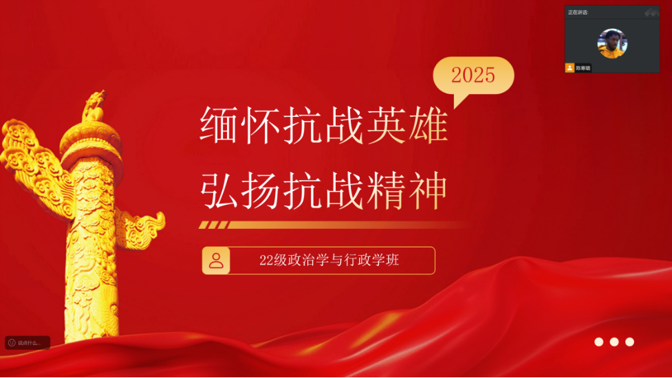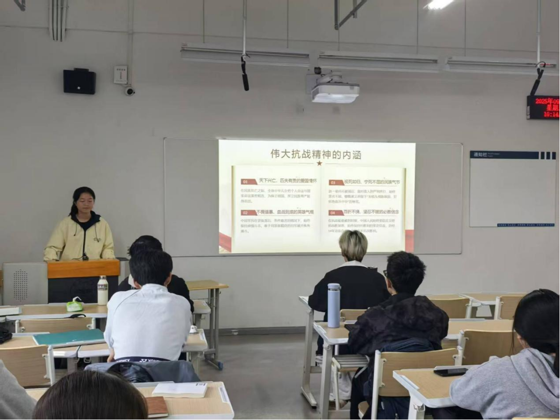 值此中国人民抗日战争暨世界反法西斯战争胜利80周年之际,学院各班级联动开展“沉浸式”爱国主义教育活动。2022级政治学与行政学班班长陈寒璐同学围绕“缅怀抗战英雄,弘扬抗战精神”开展主题班会,以时间轴方式梳理抗战历程,结合淞沪会战、平型关大捷等重要战役与英雄事迹,组织同学们深入探讨爱国主义教育的时代意义,引导大家在历史回望中筑牢信仰根基、凝聚精神力量。