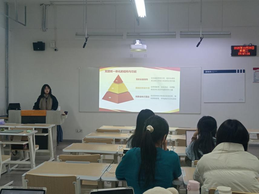 在理论阐释环节,陈雅晖同学以“金字塔模型”系统讲解党团班一体化的结构与功能。该模型将党支部、团支部与班委会的职能分为塔尖、塔身与塔基三层。塔尖是党的全面领导,党支部在思想引领、组织协调及政治核心作用方面发挥主导作用;塔身是团组织的桥梁纽带作用,在思想教育、实践活动、志愿服务及学生活动中凝聚青年力量;塔基是班委会,负责具体执行和落实各项任务,强化班级管理、学风建设与文化活动。三者形成领导、依托、落实的金字塔结构,共同培育堪当民族复兴大任的时代新人。