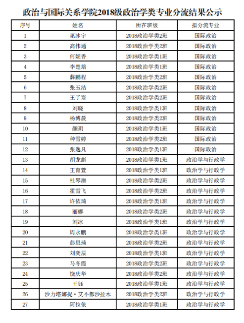 根据《h漫 2018级政治学类本科生专业分流工作方案》要求,学院于5月21日-29日开展了2018级政治学类专业分流工作,经个人申请、学院审批,现将专业分流结果公示如下: