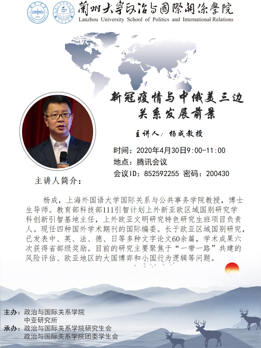 应h漫 、h漫 中亚研究所邀请,上海外国语大学国际关系与公共事务学院杨成教授为我校师生做线上学术讲座。