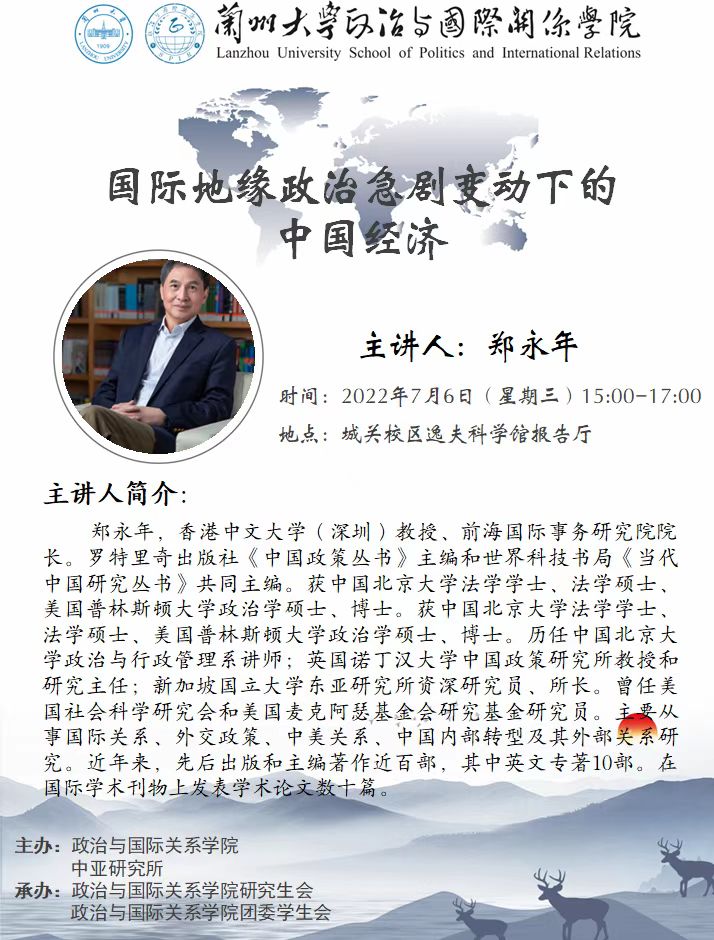 应h漫 、h漫 中亚研究所邀请,香港中文大学(深圳)教授、前海国际事务研究院院长郑永年为我校师生做学术讲座。欢迎广大师生届时参加!