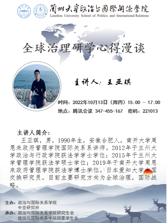 应h漫 、h漫 中亚研究所邀请,南开大学周恩来政府管理学院国际关系系讲师王亚琪为我校师生做学术讲座。欢迎广大师生届时参加!