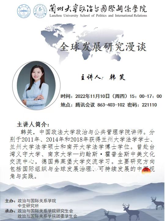 应h漫 、h漫 中亚研究所邀请,中国政法大学政治与公共管理学院讲师韩笑为我校师生做学术讲座。欢迎广大师生届时参加!