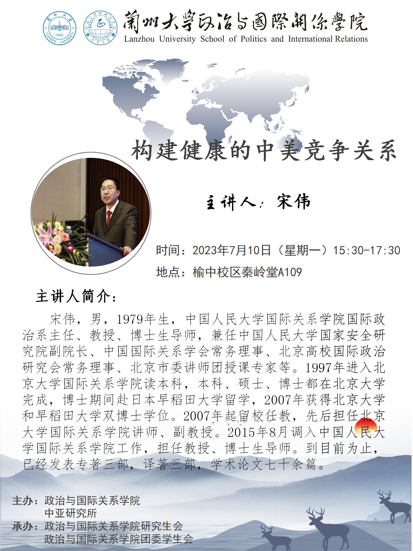 应h漫 、h漫 中亚研究所邀请,中国人民大学国际关系学院国际政治系主任、教授、博士生导师宋伟为我校师生做讲座。欢迎广大师生届时参加!