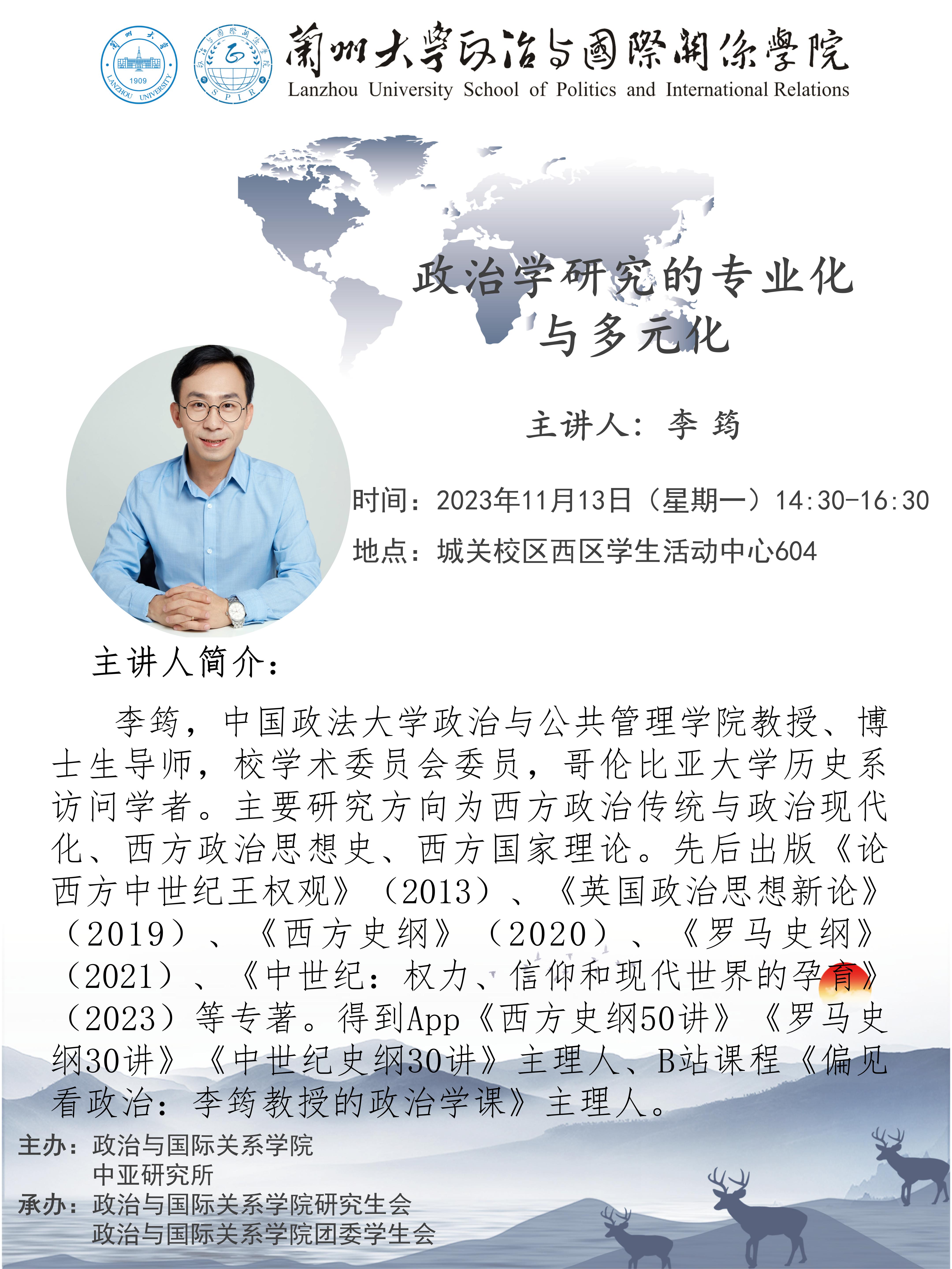 应h漫 、h漫 中亚研究所邀请,中国政法大学政治与公共管理学院教授、博士生导师李筠为我校师生做讲座。欢迎广大师生届时参加。