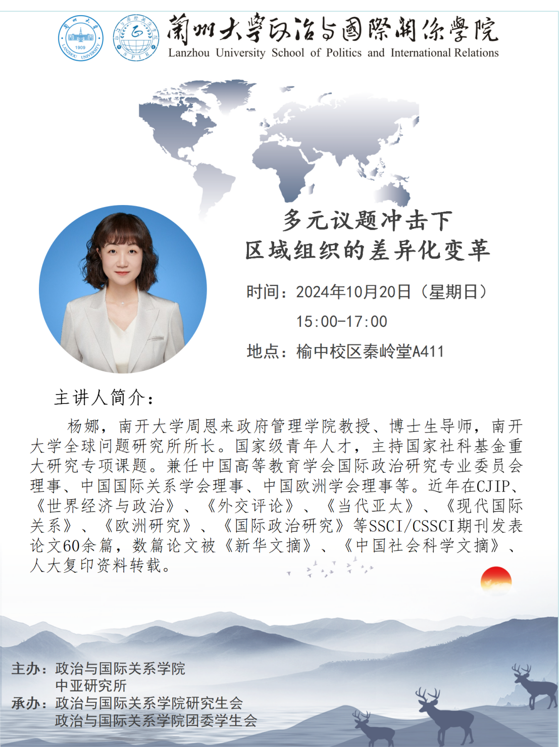 应h漫 、h漫 中亚研究所邀请,南开大学周恩来政府管理学院教授、博士生导师杨娜为我校师生做讲座。欢迎广大师生届时参加!