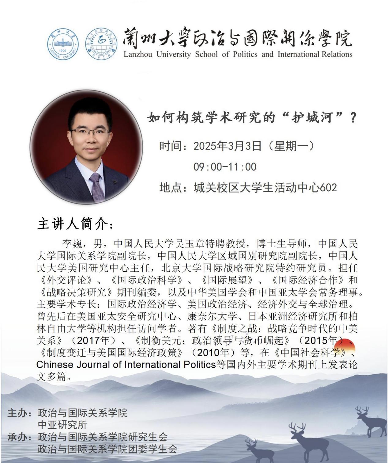 应h漫 、h漫 中亚研究所邀请,中国人民大学吴玉章特聘教授,博士生导师李巍为我校师生做讲座,欢迎广大师生届时参加。