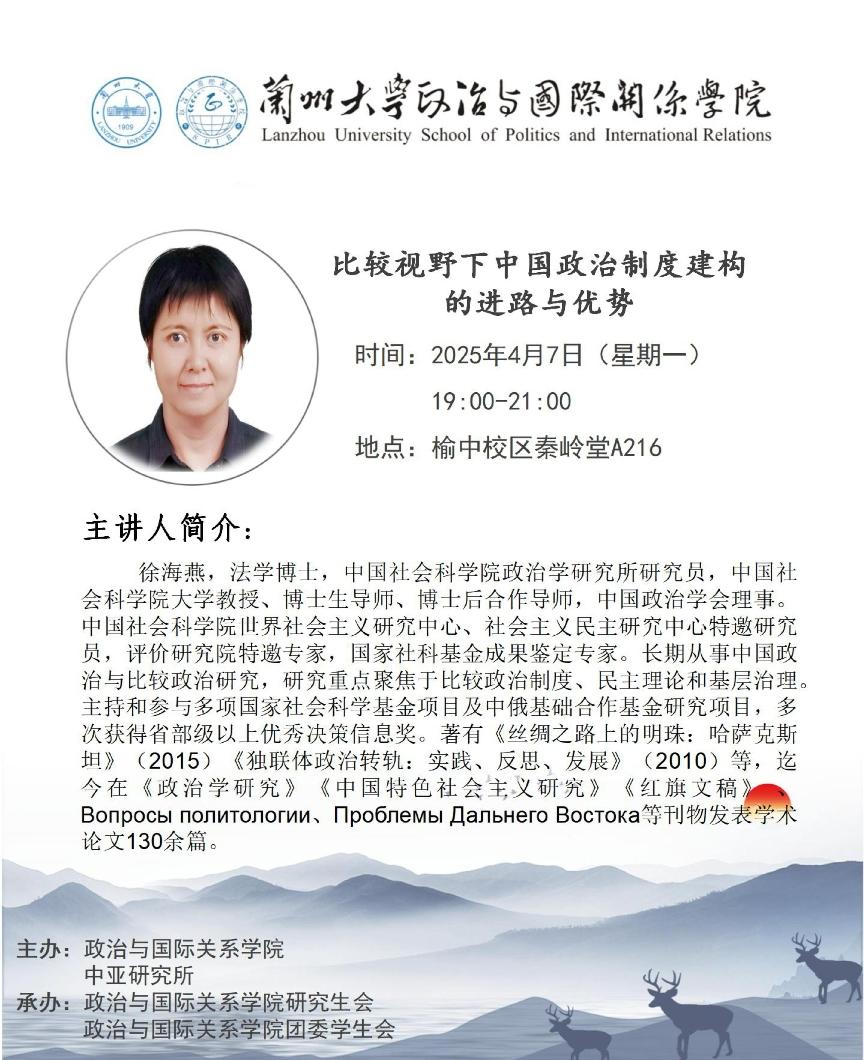 应h漫 、h漫 中亚研究所邀请,中国社会科学院政治学研究所研究员,中国社会科学院大学教授徐海燕为我校师生做讲座,欢迎广大师生届时参加。