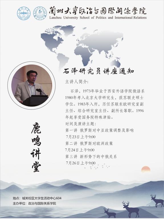 Invited by the School of Politics and International Relations of Lanzhou University, Shi Ze,the Researcher of China Institute of International Studies, will hold an academic lecture in our School on July 26th, 2019. All the teachers and students are welcome to attend.