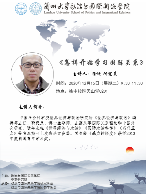 Invited by School of Politics and International Relations of Lanzhou University and the Institute for Central Asian Studies of Lanzhou University, Professor Xu Jin from University of Chinese Academy of Social Sciences will give an academic lecture to the teachers and students of our school. All teachers and students are welcome to attend.