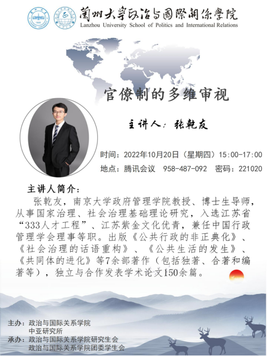 Invited by the School of Politics and International Relations of Lanzhou University, Zhang Qianyou, Professor from School of Government, Nanjing University, will give an academic lecture. All students and teachers are welcomed.