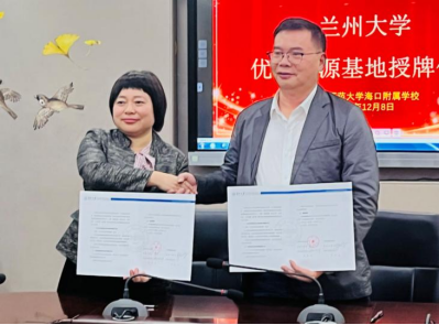优秀生源基地”授牌仪式,与北京师范大学海口附属中学校长陆炳荣现场签订优秀生源基地协议书。
