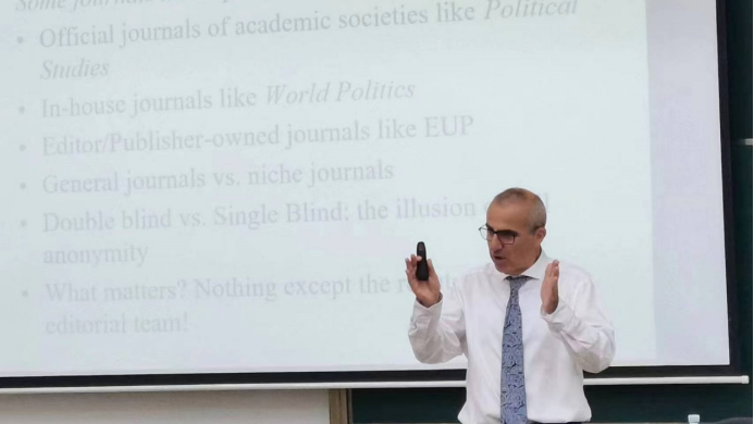 2023年9月18日早上9:00,应h漫 国际与合作交流处、h漫 、h漫 中亚研究所邀请,德国康斯坦茨大学国际政治讲席教授Gerlad Heinrich Schneider为我校师生作题为“Academic Writing: Seven Sins of Doing Research(学术写作中的七宗罪)”的学术讲座,本次讲座由学院副教授陈一一老师主持并作辅助讲授,学院全体本科生及部分研究生参加。