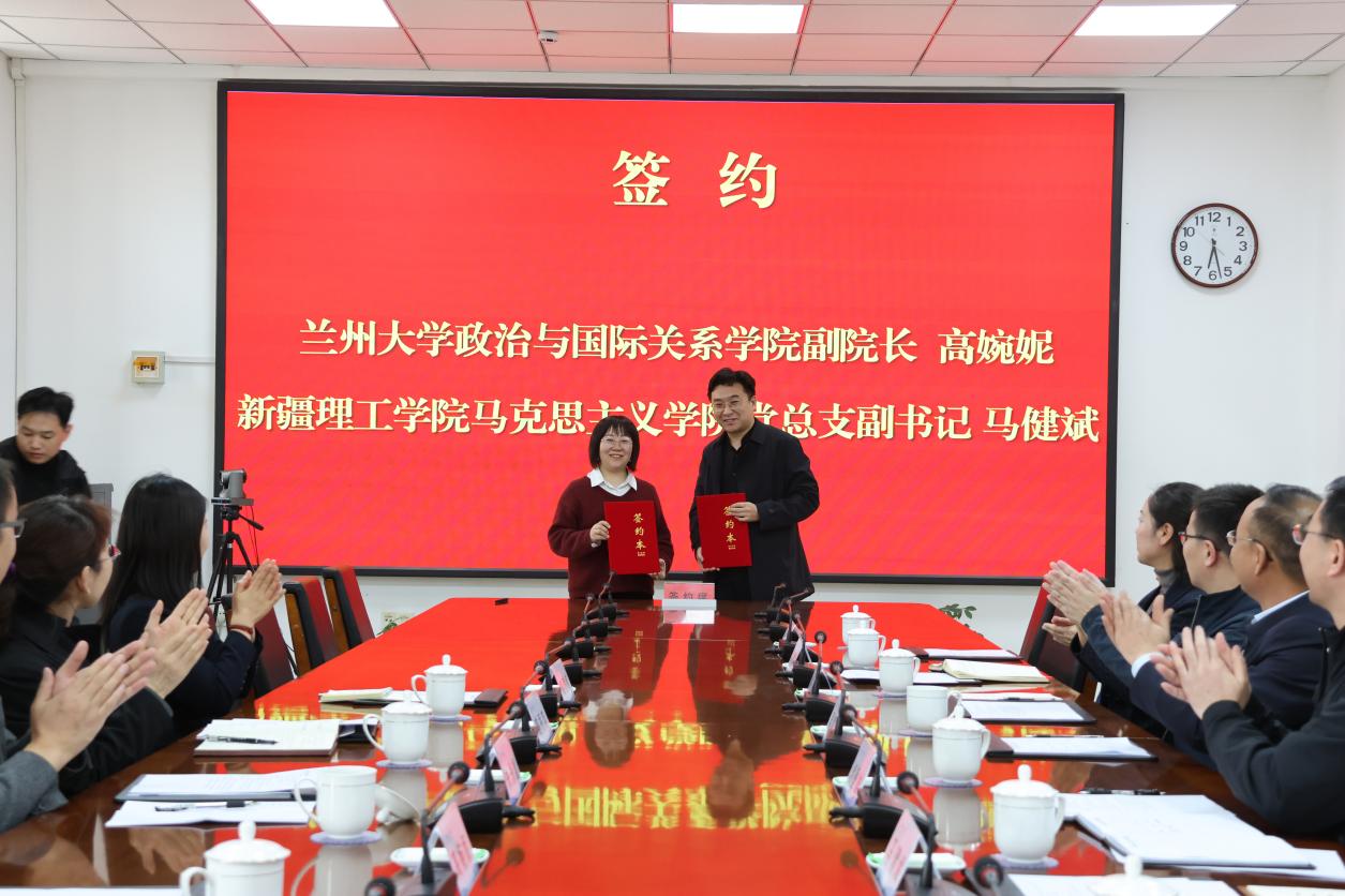 高婉妮与新疆理工学院马克思主义学院党总支副书记马健斌签署了《新疆理工学院区域国别(吉国)研究中心 h漫 中亚研究所年度合作备忘录》。