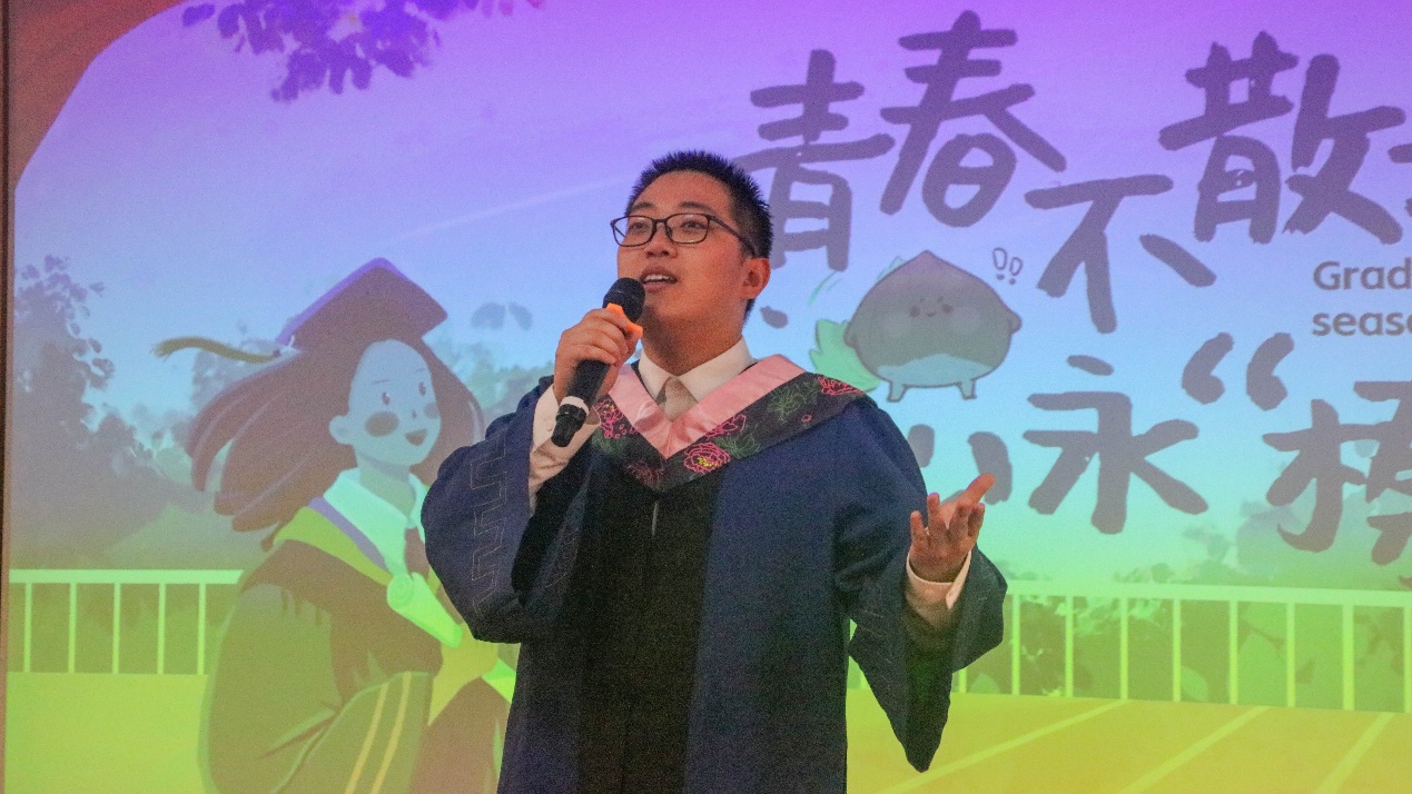 接着,毕业生班主任代表肖涵副教授发言。肖涵老师向毕业生们表示祝贺,并表达了她身为班主任对毕业生们深切的不舍与真心的勉励,希望同学们少内耗、能抗事、有理想、能进取,做一个有良知、肯行动的人,在空闲时常回母校看看,祝福同学们鹏程万里、大展宏图、共襄盛世。